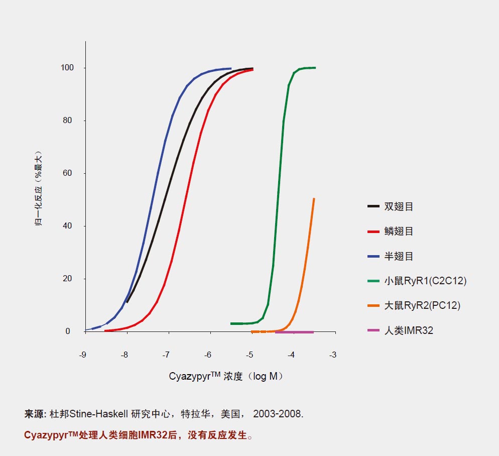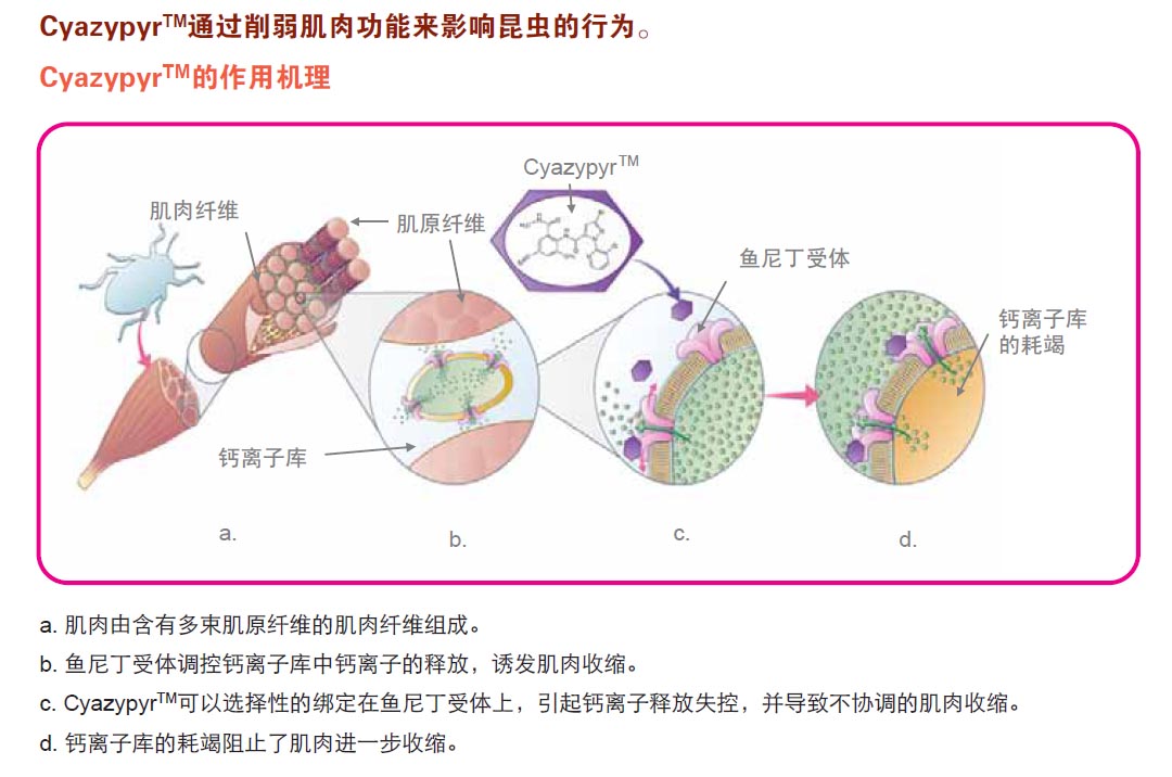 CyazypyrTM能夠激活昆蟲(chóng)魚(yú)尼丁受體(RyRs),該受體對(duì)肌肉功能起到關(guān)鍵作用。肌肉的收縮需要鈣離子從細(xì)胞 內(nèi)鈣庫(kù)中釋放到細(xì)胞質(zhì)內(nèi)。魚(yú)尼丁受體起到選擇性離子通道的作用,可控制鈣離子的釋放。CyazypyrTM分子可以和 魚(yú)尼丁受體結(jié)合,導(dǎo)致鈣離子的流失,從而阻止肌肉進(jìn)一步收縮。