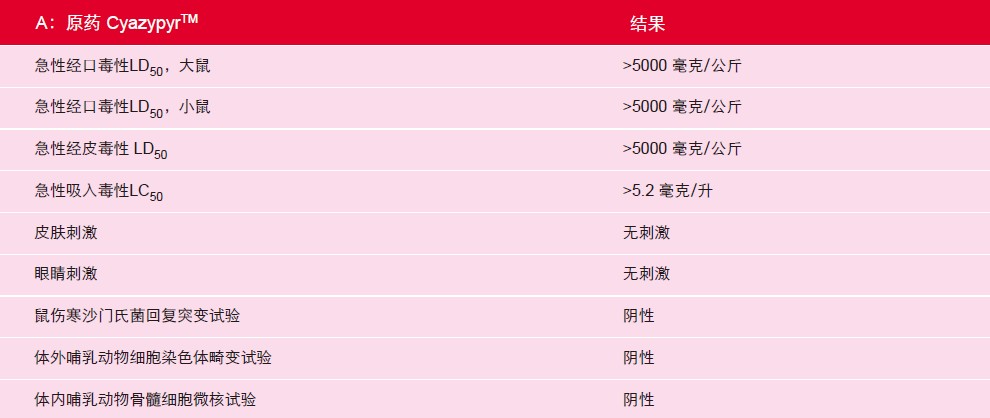 在急性、亞慢性和慢性動(dòng)物研究中,CyazypyrTM對(duì)哺乳動(dòng)物均表現(xiàn)為低毒,這一特性可以縮短再入園時(shí)間 (REI)和安全采收間隔期(PHI)。同時(shí)也簡(jiǎn)化了對(duì)個(gè)人防護(hù)裝備(PPE)的要求。