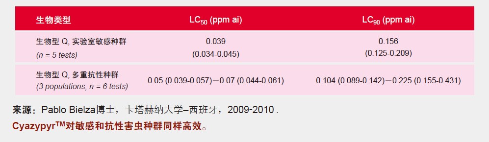 通過基線測定研究表明,CyazypyrTM與其它作用機(jī)理的殺蟲劑沒有交互抗性,在進(jìn)一步實(shí)驗(yàn)室研究中選擇已知抗性機(jī)制害蟲品系再次證明這些種群對CyazypyrTM高度敏感。