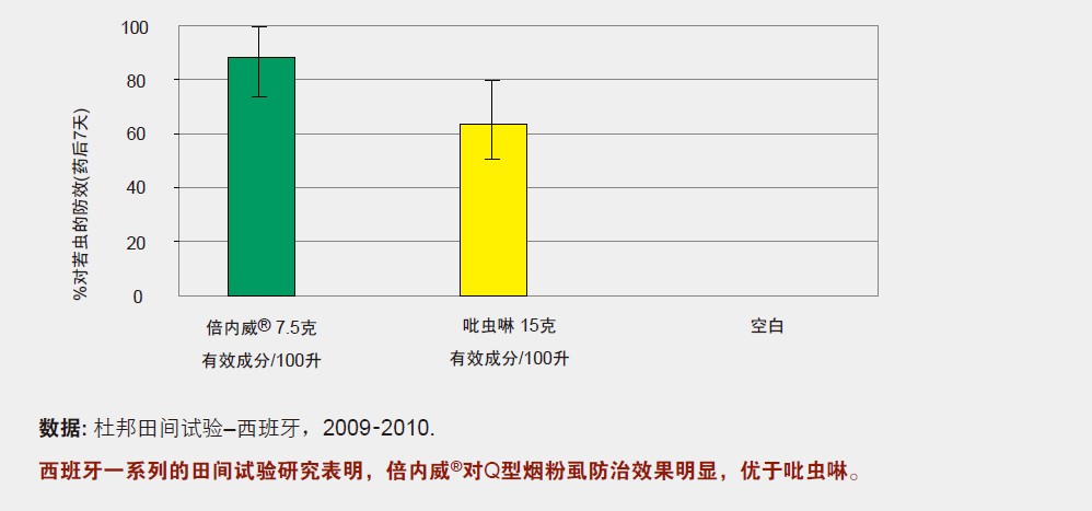 在西班牙進(jìn)行的多個杜邦TM倍內(nèi)威®防治高抗生物型Q型煙粉虱的田間試驗(yàn)中,進(jìn)一步證實(shí)了杜邦TM倍內(nèi)威®可防治 對多種殺蟲劑已產(chǎn)生抗藥性的煙粉虱種群。