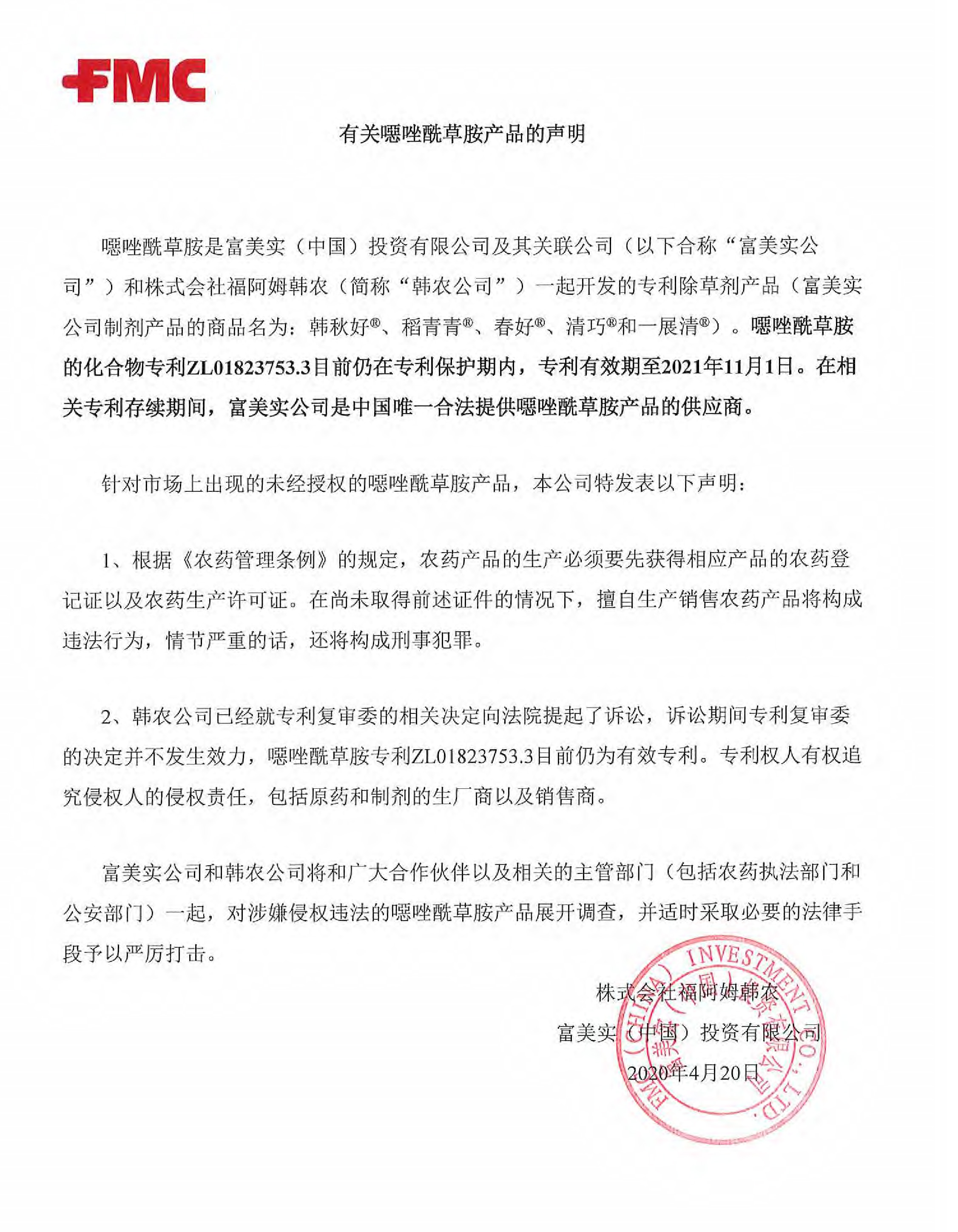 聲明│有關(guān)噁唑酰草胺產(chǎn)品的聲明