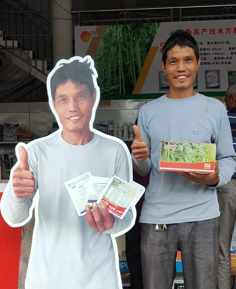 唐咸家在農(nóng)資店和自己的人形立牌合影