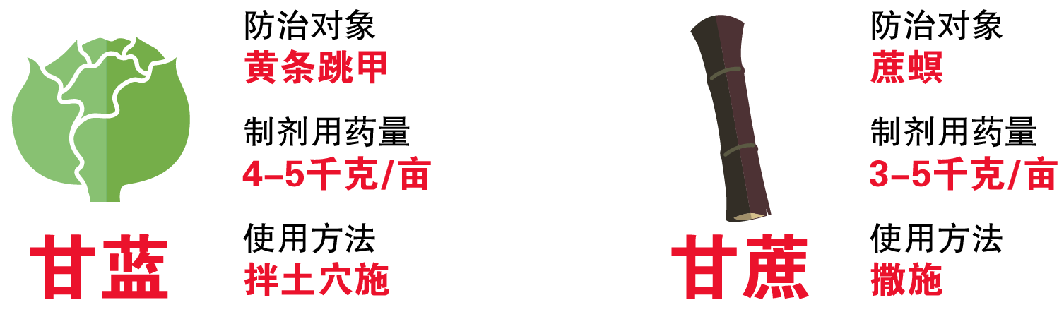 高效廣譜:在甘蔗田使用,對(duì)蔗螟防效優(yōu)異;在甘藍(lán)田使用,對(duì)黃條跳甲防效顯著。