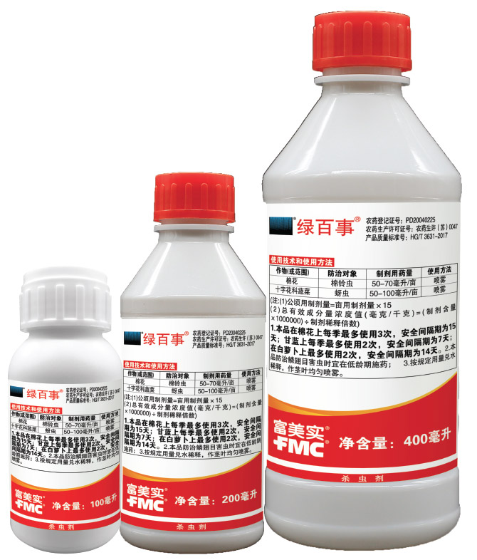 綠百事® 是美國富美實(FMC) 公司推出的一種生物活性較高的擬除蟲菊酯類殺蟲劑,它是由氯氰菊酯的高效異構體組成,具有觸殺和胃毒作用。單位面積用量較少,效果較好,可用于防治棉花棉鈴蟲和十字花科蔬菜蚜蟲。