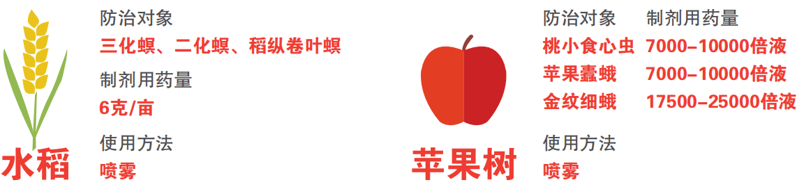 蘋果樹 :安全采收間隔期14 天,每季最多使用2 次。水稻 :安全采收間隔期21 天,每季最多使用2 次。