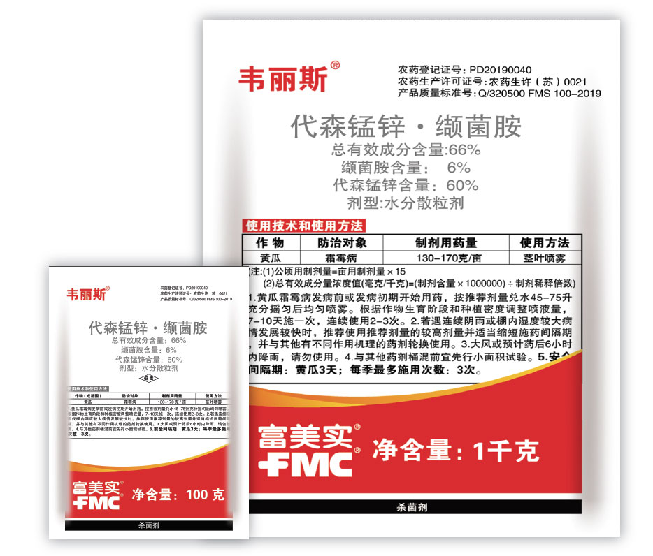 韋麗斯®是由美國(guó)富美實(shí)(FMC)公司推出的全新專利防治霜霉病害殺菌劑,由羧酰胺類專利化合物纈菌胺和代森錳鋅復(fù)配而成,對(duì)黃瓜霜霉病具有優(yōu)異的保護(hù)活性和早期治療活性。