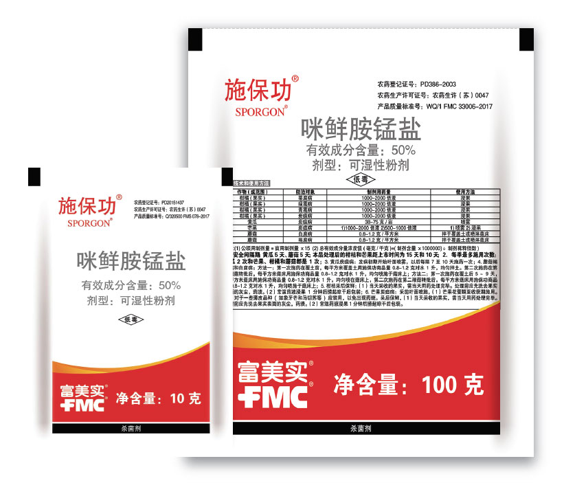 施保功® 是美國富美實(FMC)公司推出的高效、廣譜、低毒型殺菌劑,具有預(yù)防、治療和鏟除等多重作用,具接觸和局部滲透功能。速效性好、持效期長、殺菌譜廣,適用于多種作物莖葉噴霧、果蔬保鮮,對子囊菌引起的病害防效極佳,對半知菌引起的病害也有較高的活性。被許多專家學(xué)者推薦為有害生物防治綜合策略產(chǎn)品,是抗性管理規(guī)劃中的首選產(chǎn)品。
