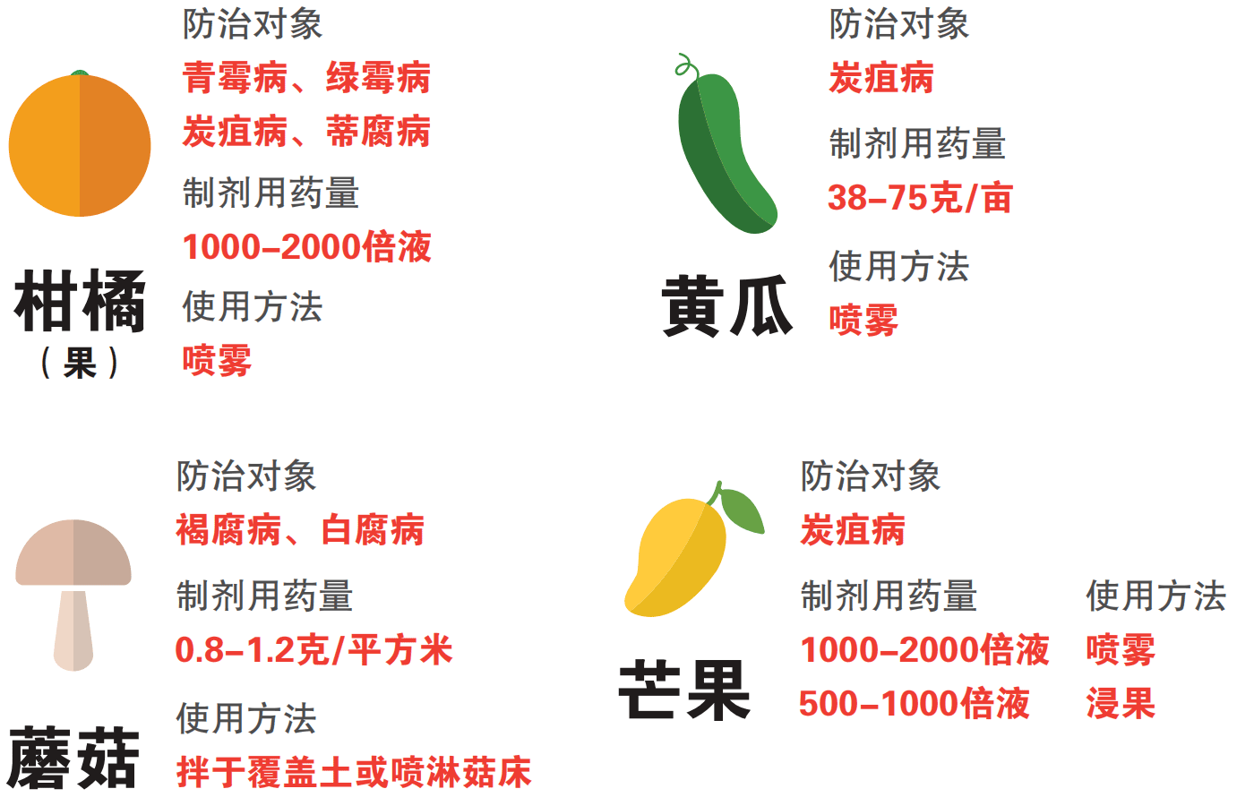 ●安全間隔期:黃瓜5天、蘑菇5天、柑橘15天和芒果10天。