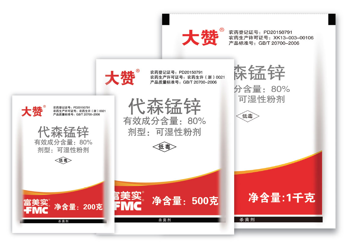 大贊® 是美國富美實(FMC)公司推出的廣譜低毒保護(hù)性殺菌劑,以鋅、錳全絡(luò)合狀態(tài)形式結(jié)合,安全、高效,易被作物吸收和利用,對多種真菌性病害均具有很好的防治效果。