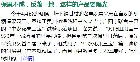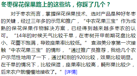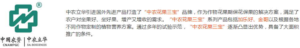 中農(nóng)立華引進(jìn)國外先進(jìn)產(chǎn)品打造了“中農(nóng)花果三寶”品牌,作為作物花果期保花保果的解決方案,滿足了農(nóng)戶對(duì)坐果好、坐好果、增產(chǎn)又增收的需求。“中農(nóng)花果三寶”系列產(chǎn)品包括加樂好、金哥以及根據(jù)各地不同作物定制的植物營養(yǎng)方案。通過多年的試驗(yàn)示范,“中農(nóng)花果三寶”逐漸凸顯出優(yōu)勢(shì),具備了大面積推廣的條件。